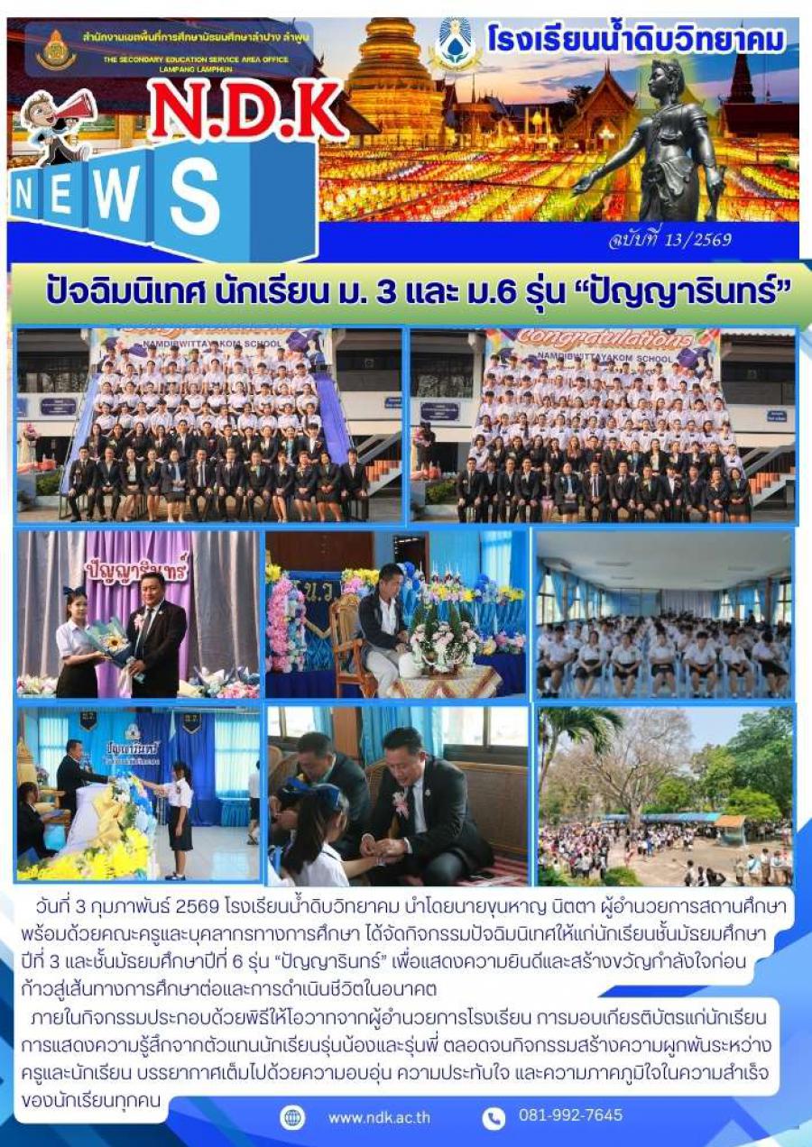 วันที่ 3 กุมภาพันธ์ 2569 โรงเรียนน้ำดิบวิทยาคม นำโดยนายขุนหาญ นิตตา ผู้อำนวยการสถานศึกษา พร้อมด้วยคณะครูและบุคลากรทางการศึกษา ได้จัดกิจกรรมปัจฉิมนิเทศให้แก่นักเรียนชั้นมัธยมศึกษาปีที่ 3 และชั้นมัธยมศึกษาปีที่ 6 รุ่น “ปัญญารินทร์” เพื่อแสดงความยินดีและสร้างขวัญกำลังใจก่อนก้าวสู่เส้นทางการศึกษาต่อและการดำเนินชีวิตในอนาคต